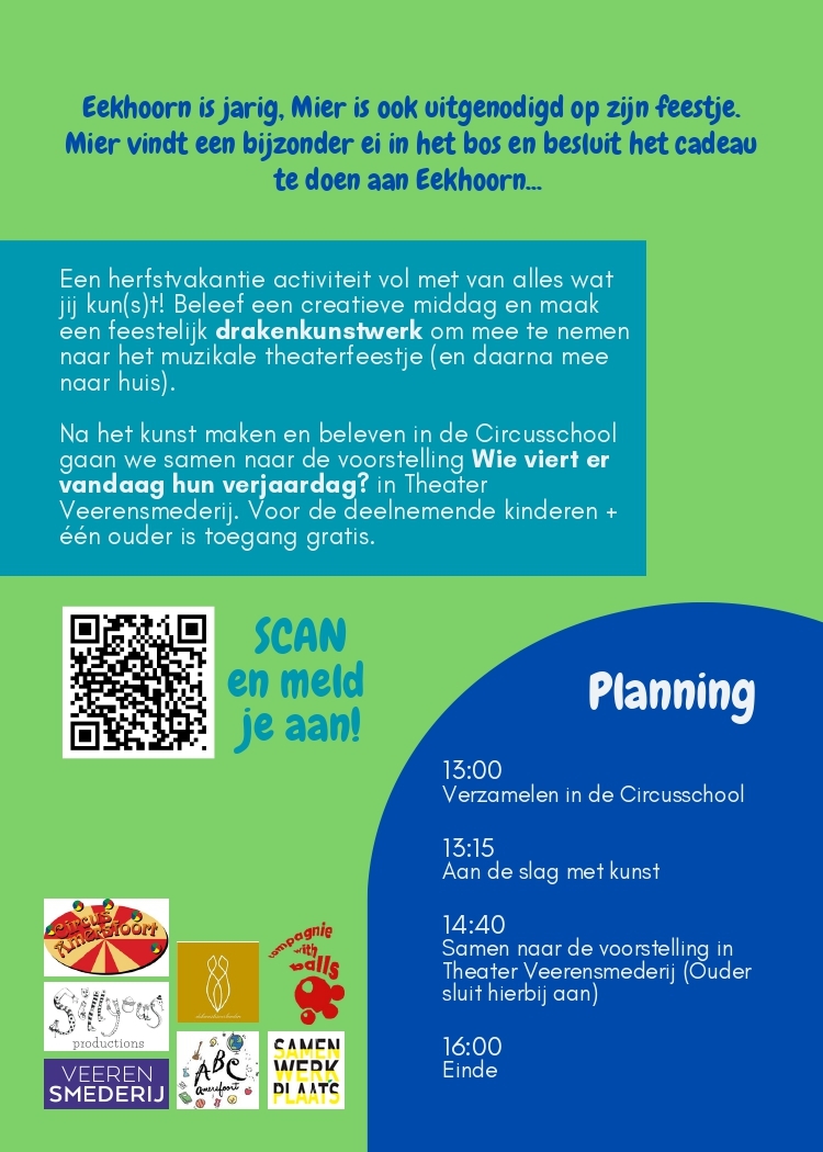 Daarna gaan we samen naar de voorstelling Wie viert er vandaag hun verjaardag? in Theater Veerensmederij. Voor de deelnemende kinderen + één ouder zijn de kaartjes voor de voorstelling gratis.