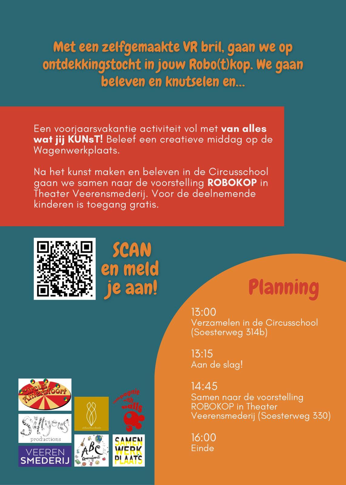 Een voorjaarsvakantie activiteit vol met van alles wat jij KUNsT! Beleef een creatieve middag op de Wagenwerkplaats. Na het kunst maken en beleven in de Circusschool gaan we samen naar de voorstelling ROBOKOP in Theater Veerensmederij. Voor de deelnemende kinderen is toegang gratis.